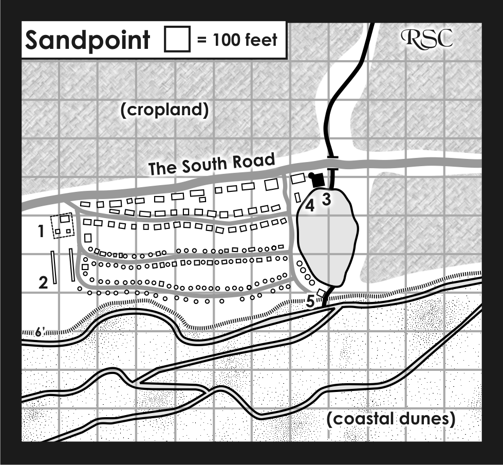 Sandpoint is located on a low bluff overlooking the coastal dunes of the regions. From here it is about a 1/2 mile to the high tide mark on the beach. The bluff is only 6' high however it is steadily eroding. This has caused the wealthiest halflings to live near the king's road and the poorest nearest the bluff. The wide spaces between the rows of houses are used as pastures and gardens. Many make a small sum of money renting their pasture during the annual sheep shearing.- Hightower Estate, the ancestral home of the HighTowers of Sandpoint. Several extended families living under one roof make this place a madhouse.